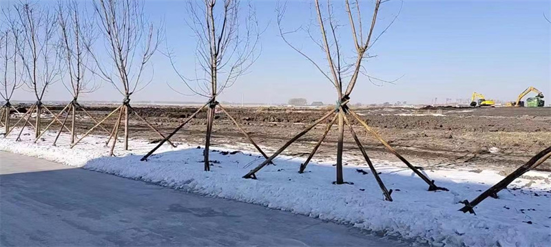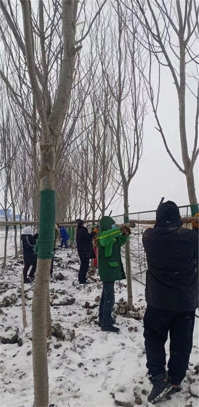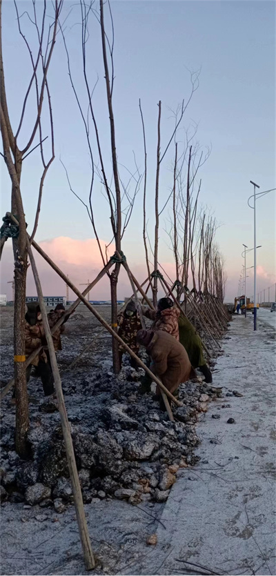 2022年入秋后,畜牧园区绿化项目因场地泥泞无法如期进场。入冬后,疫情突发再次导致施工延期。收到疫情全面放开的消息后,园林公司第一时间召开专题会议,对畜牧园区绿化项目进行了周密部署,从苗木起挖运输、吊卸栽植,到封坑浇水、架杆固定、整形修剪都做了精心安排,强调了安全生产的重点,确保施工全过程无缝衔接、施工效率提高到极致、施工成本控制到极限、生产安全事件零发生。工程部与苗木基地密切配合,不畏困难,奋勇拼搏,经过15天的连续奋战,于2022年12月31日完成了1450株乔木的栽植。截至1月15日,园区内满足栽植条件的苗木共计2082株,全部栽植到位。