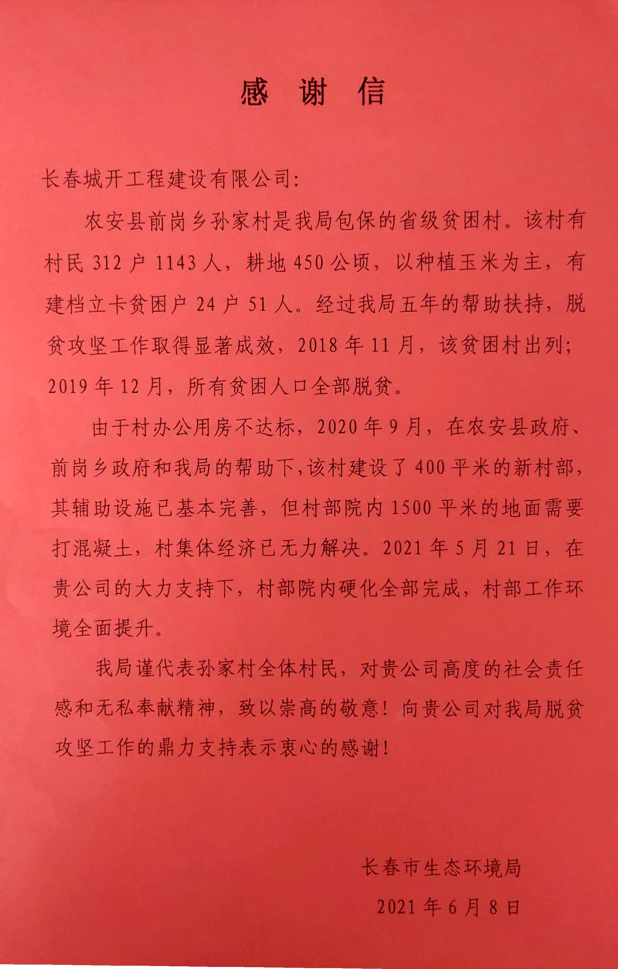 近日,长春城开工程建设有限公司(以下简称建设公司)收到一封来自长春市生态环境局(以下简称市环境局)的感谢信。信中,市环境局代表农安县前岗乡孙家村全体村民,对建设公司2021年5月21日在“我为群众办实事”学习教育实践中,帮助孙家村铺设1500平方米路面,提升村部环境,助力市环境局脱贫攻坚工作表示感谢。