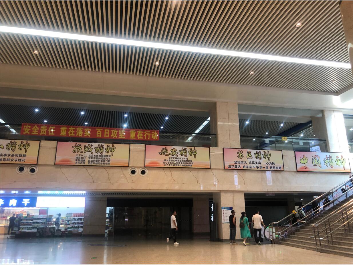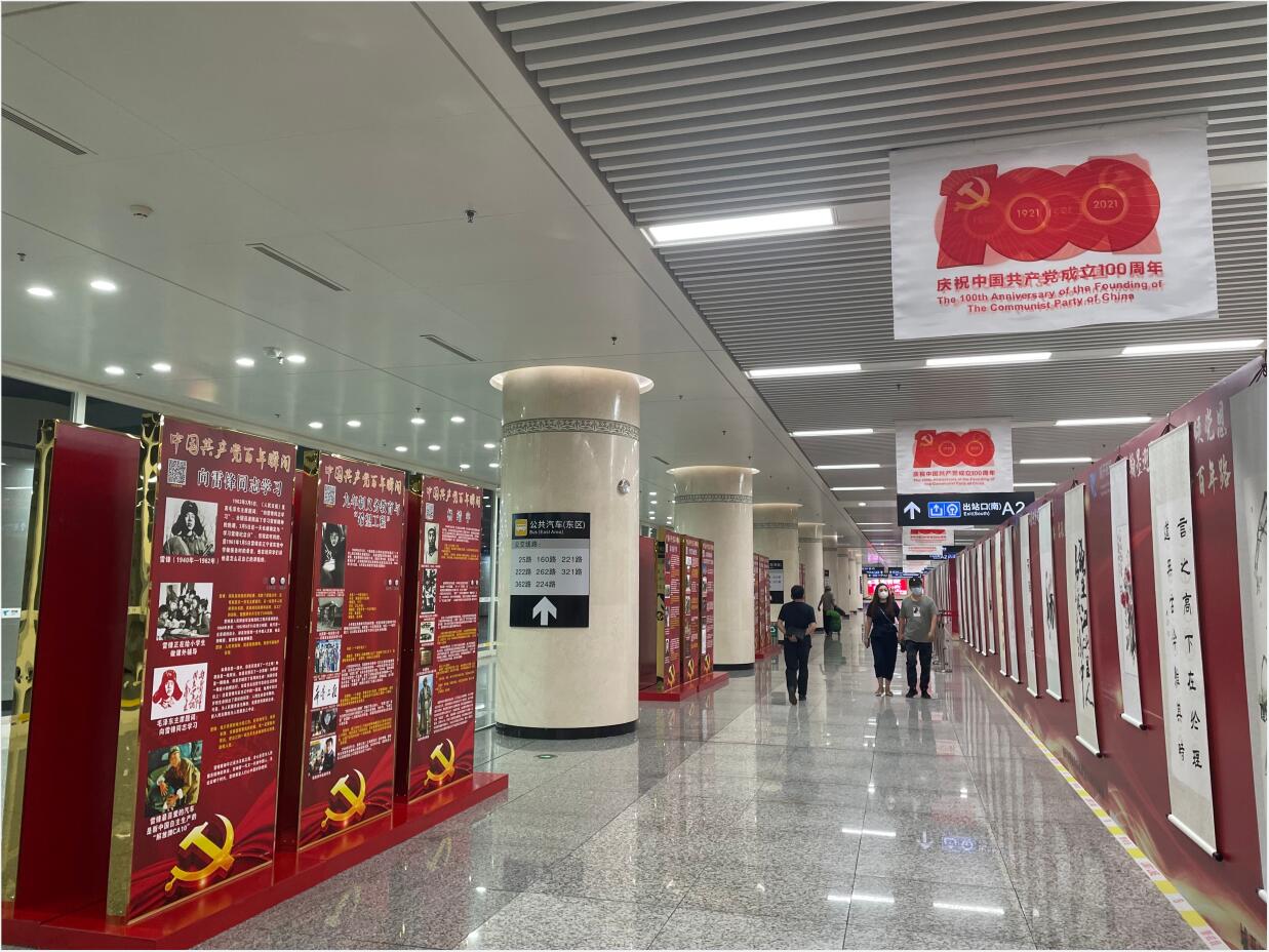 在换乘中心悬挂时代金句组成的百幅“红色吊幔”;将中国共产党百年历史璀璨精神缩印成“中国精神”标语;以“奋斗百年路 启航新征程”为主题的美陈;悬挂国旗及庆党百年华诞LOGO标识300面;利用LED屏及海报机等媒介宣传党的百年华诞。